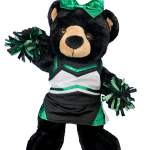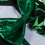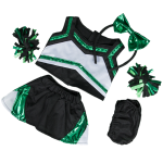 Adorable cheer outfit with matching green and black pompoms, cheer bow, and spankies