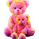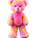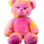 This colorful bear has cool textured fur, adorable embroidered eyelashes, heart shaped nose and a heart shaped patch on her tummy! She’s a great valentine’s day gift or for anytime you need a little love! This bear has plastic eyes!